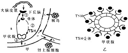 3、连线题 下图所示的调节过程是人体稳态的重要组成部分。甲图中①②③分别代表下丘脑、垂体及甲状腺进行的生理活动过程,a、b、c分别代表图中所示的三种内分泌腺所分泌的激素。乙图表示垂体所分泌的促甲状腺激素(TSH)作用于甲状腺的示意图。请据图回答下列问题: