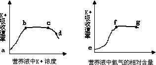3、选择题 下图表示培养液中K+浓度及溶氧量对小麦根系细胞吸收K+速率的影响。下列有关两曲线形成机理的解释正确的是?