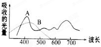5、选择题 如图为用分光光度计测定叶片中两类色素吸收不同波长光波的曲线图,请判定A和B分别为何种色素?