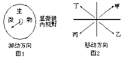 4、选择题 使用普通光学显微镜观察水中微生物,若发现视野中微生物如图1所示方向游动,则应该把载玻片向图2所示的哪个方向移动