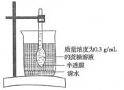 5、选择题 按如图所示安装渗透作用装置,将半透膜袋缚于玻璃管下端,半透膜袋内部装有50 mL质量浓度为0.3 g/mL的蔗糖溶液。下列有关说法不正确的是?