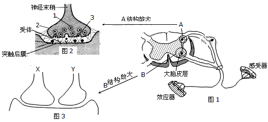 (3)假如图3中的Y来自图1中的A,图3中的X来自大脑皮层,当感受器接受一个刺激后,导致效应器产生反应,则Y释放的物质对突触后膜具有___________作用,如果大脑皮层发出的指令是对这个刺激不作出反应,则X释放的物质对突触后膜具有___________作用,导致效应器不产生相应反应,这又说明一个反射弧中的低级中枢要接受__________________的控制。