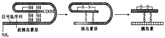 2、选择题 胰岛素是在胰岛B细胞中合成的,刚合成的多肽称前胰岛素原,在信号肽酶的作用下,前胰岛素原的信号肽被切除,成为胰岛素原。最后胰岛素原在蛋白酶的作用下水解,生成胰岛素和一个多肽(如下图)。胰岛素原水解所需的水中的氢用于