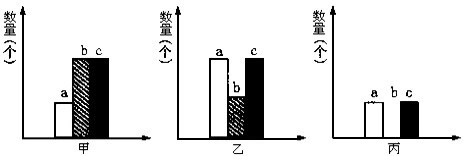 5、选择题 下图中的甲、乙、丙表示动物细胞有丝分裂中的三个阶段,a是染色体,b是染色单体,c是DNA分子数,a、b、c的数量关系正确的是