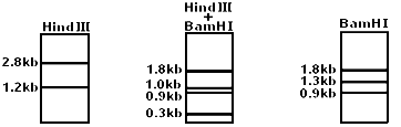 5、选择题 在DNA 测序工作中,需要将某些限制性内切酶的限制位点在DNA上定位,使其成为DNA 分子中的物理参照点。这项工作叫做“限制酶图谱的构建”。假设有以下一项实验:用限制酶 HindⅢ,BamHⅠ和二者的混合物分别降解一个4kb(1kb即1千个碱基对)大小的线性DNA 分子,降解产物分别进行凝胶电泳,在电场的作用下,降解产物分开,如下图所示。