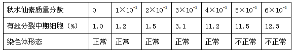2、综合题 青虾细胞的染色体数目多而且形态小,为确定其染色体数目,需要制备染色体标本。科研人员挑选若干组数量相等、每个体重(5+0.2)g、活动力强、性成熟的青虾,分别腹肌注射0.1ml质量分数不等的秋水仙素,对照组注射等量的生理盐水;24h后,取出心脏等6种器官组织,分别制成装片,通过观察和统计,得出结论。以下是该实验的部分结果,请据此回答相关问题。