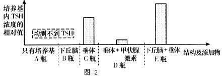 (4)为研究影响促甲状腺激素(TSH)分泌的因素,研究者从刚宰杀的大白鼠体内分离出新鲜的下丘脑和垂体,然后将这些结构单独或一起培养于含有或不含有甲状腺激素的培养基中,培养后测定培养基内TSH的浓度,结果如图2: