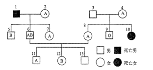 4、选择题 下图是某家庭11号个体对自己双亲的家系ABO血型进行调查得出的结果,预测1号和13号个体的血型可能是