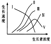 3、选择题 下图中曲线Ⅲ表示茎伸长生长与植物生长素浓度的关系。如果同样浓度范围的植物生长素施用于侧芽,则能代表生长状况的曲线是