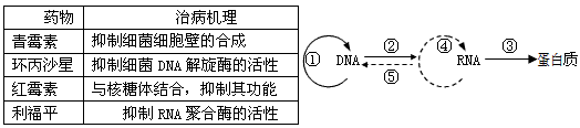 D.环丙沙星、利福平和红霉素分别能抑制细菌的①、②和③过程