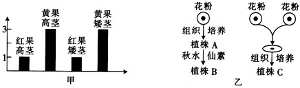 (2)乙图为用该红果高茎番茄植株的花粉进行有关操作的示意图。①图中的植株A称为_________,该植株基因型及比例是______。②植株C可能有______种基因型,______种表现型。③植株B、C相同的基因型有____种。