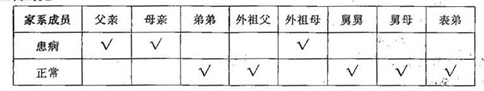 1、选择题 小方(女)患有某种单基因遗传病,下表是与小芳有关的部分家属患病情况调查结果。下列相关分析正确的是