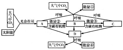 4、选择题 下图为太阳能进人生物群落及在生物群落内流动的部分图解,下列说法正确的是