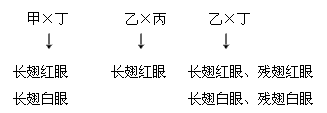 5、选择题 在果蝇中,长翅(B)对残翅(b)是显性,位于常染色体上;红眼(A)对白眼(a)是显性,位于X染色体上。现有两只雄果蝇甲、乙和两只雌果蝇丙、丁,这四只果蝇的表现型全是长翅红眼,用它们分别交配,后代的表现型如下: