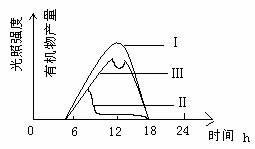 5、选择题 一密闭透明薄膜大棚内,一天中的光照强度与棚内植物制造有机物量分别如图中曲线Ⅰ、曲线Ⅱ所示。在采取某项措施后,棚内植物制造有机物量如图中曲线Ⅲ所示。采取的这项措施是?