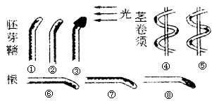3、选择题 当植物受到环境刺激时,下图中所表示的生长素分布与生长的情形正确的是(黑点代表生长素的分布)
