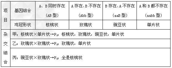 4、填空题 家禽鸡冠的形状由两对基因(A和a,B和b)控制,这两对基因按自由组合定律遗传,与性别无关。据下表回答问题: