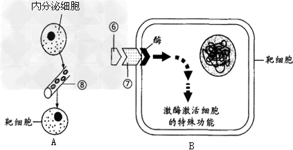 (1)如果图中A过程的内分泌细胞分泌胰岛素,那么胰岛素主要通过___________的运输到达靶细胞。如果胰岛素与B中的⑦结合,则靶细胞内发生的物质变化主要有___________。