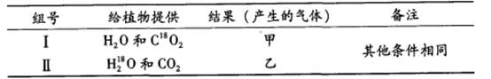1、选择题 下表为鲁宾和卡门利用同位素标记法研究光合作用的实验记录,据表判断甲、乙分别是