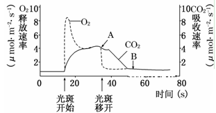 4、选择题 阳光穿过森林中的空隙形成“光斑”,它会随太阳的运动和枝叶的摆动而移动。如图表示一株生长旺盛的植物在“光斑”照射前后的光合作用过程中吸收CO2和释放O2的有关曲线,此曲线说明
