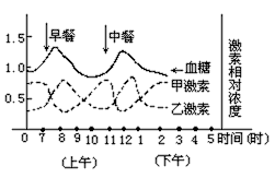 3、连线题 图是某同学血糖浓度和甲、乙两种调节血糖浓度相关的激素相对浓度的变化图,据图回答: