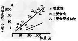 1、选择题 动物为保证食物等生存资源而占据的空间叫领域。如图表示各种鸟类的领域面积与体重、食性的关系,据图分析正确的是