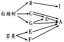 4、选择题 下图表示一个人工白杨林中分层生活着的苔类、昆虫及鸟类的多个生物种类之间的相互关系。下列有关图的叙述正确的是