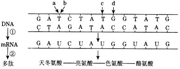 4、连线题 下图表示果蝇某正常基因片段控制合成多肽的过程。a~d表示4种基因突变,a丢失T/A,b由T/A变为C/G,c由T/A变为G/C,d由G/C变为A/T。假设4种突变都单独发生,请回答: