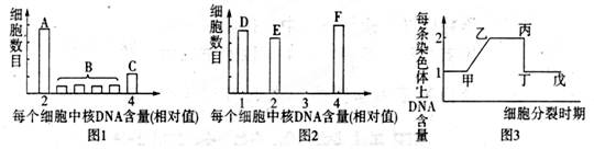 3、选择题 根据每个细胞中核DNA相对含量的不同,将某高等哺乳动物睾丸中连续增殖的精原细胞归为A、B、C三组,每组细胞数目如图l所示;将睾丸中参与配子形成过程的细胞归为D,E,F三组,每组细胞数目如图2所示;根据细胞中每条染色体上DNA含量在细胞周期中的变化绘制曲线,如图3所示。下列叙述中错误的是?