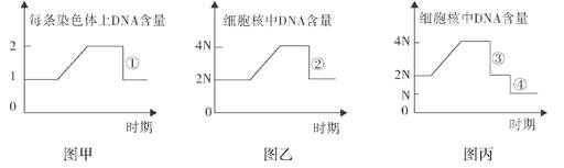 3、选择题 二倍体生物细胞有丝分裂和减数分裂过程中DNA含量的变化如图甲、乙、丙所示。在甲、乙、丙三图 中的①?④中均涉及到DNA分子减半问题,其中“减半”的原因完全相同的是