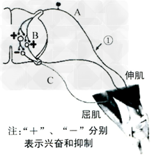 5、选择题 当膝反射进行时,除了伸肌收缩外,同时必须使屈肌舒张。下图表示膝反射,①是神经元上的实验位点,A、B、C是反射弧的部分结构。据图分析,下列叙述正确的是