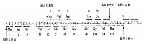 4、选择题 FX174噬菌体的遗传物质是单链DNA,感染宿主细胞时,先形成复制型的双链DNA分子(其中母链称为正链DNA,子链称为负链DNA)。转录时以负链DNA作为模板合成mRNA。下图为FX174噬菌体的部分基因序列及其所指导合成的蛋白质部分氨基酸序列。下列说法不正确的是