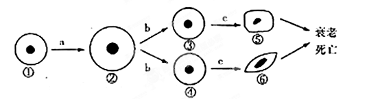 4、选择题 下图为人体细胞生长、分裂、分化、衰老和死亡过程的示意图,图中①~⑥为各个时期的细胞,a~c表示细胞所进行的生理过程。据图分析,下列叙述正确的是