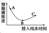 本题解析:试题分析:根据题意和图示分析可知:AB段细胞液浓度下降,说明细胞吸水,但由于细胞壁的存在,因此细胞体积不会明显增大,A错误。AB段植物细胞一直在吸收水分,B错误。C点明显低于A点,说明BC段细胞开始失水,但没有发生质壁分离,C错误。从细胞液浓度因吸水而下降,后又升高来看,说明有机农药溶于水中容易被植物细胞吸收,所以D正确。