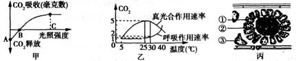 1、选择题 下图甲、乙、丙分别表示某植物光合作用速率与光照强度之间的关系、温度与光合作用速率之间的关系及植物叶片的结构示意图。下列说法不正确的是