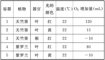 2、选择题 把等量的不同植物的不同器官放在封闭容器中,并将它们置于相同强度不同颜色的光照下。8 h后,对容器中的氧气含量进行测量,得到下表所示的实验数据。下列相关分析正确的是