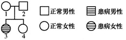 1、选择题 下图表示人类某基因遗传病的系谱图。假设3号与一正常男性婚配,生了一个既患该病又患白化病(两种病独立遗传)的儿子,预测他们生一个正常女儿的概率是
