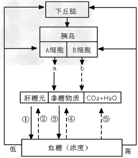 (1)当人体内环境中血糖浓度升高时,胰岛分泌[b]__________增多,进而促进[⑤]_________等过程的进行。