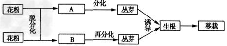 (1)通过花药培养产生花粉植株有两种途径,一种是花粉通过A_________阶段发育成植株,另一种是花粉在诱导培养基上先形成B愈伤组织,再将其诱导分化成植株。这两种途经并没有绝对的界限,主要取决于培养基中_________。