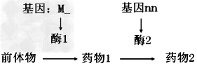 (3)现有两纯种植物,一种只能合成药物1,另一种两种药物都不能合成,这两种植物杂交,F1都只能合成药物l,F1自交产生的F2中的三种表现型:只能合成药物1、两种药物都能合成、两种药物都不能合成,比值为9:3:4。F2的性状分离比说明基因M(m)与N(n)的遗传遵循__________规律。两种亲本植物的基因型分别是________、________,将F2中只能合成药物l的种子播种后进行自交,后代出现能合成两种药物的纯合子的比例是___________。
