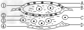 4、选择题 下图是人体某组织内各种结构示意图,A、B、C、D表示的是结构,①②③④表示的是液体,有关此图叙述不正确的是