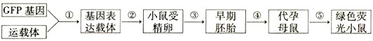 5、连线题 2008年诺贝尔化学奖授予了三位在研究绿色荧光蛋白(GFP)方面做出突出贡献的科学家。绿色荧光蛋白(GFP)会发出绿色荧光,可借助荧光跟踪蛋白质在细胞内部的移动情况,帮助推断蛋白质的功能。下图表示培育绿色荧光小鼠的基本流程: