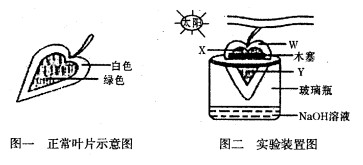 3、选择题 某植物(其叶片如图一所示)放在黑暗中两天后,根据图二所示,处理其中一块叶片。然后将整株植物置于阳光下4h,取该叶片经酒精脱色处理后,滴加碘液(棕黄色)显色,下列有关该实验结果和现象的描述正确的是
