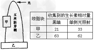 4、选择题 如图表示研究生长素在玉米胚芽鞘中运输的实验,把不含生长素的琼脂块甲和琼脂块乙按照如图所示位置放置。下表是实验装置在黑暗中和单侧光照射一段时间后(如图所示),琼脂块甲和琼脂块乙中生长素的相对量,该实验说明