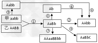 5、选择题 下图中甲、乙表示水稻两个品种,A、a和B、b表示分别位于两对同源染色体上的两对等位基因,①~⑧表示培育水稻新品种的过程。下列叙述中,正确的是