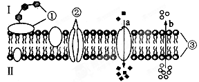 图中b过程属于自由扩散,特点是从高浓度运输到低浓度,不需要载体和能量,a是主动运输,特点是从低浓度运输到高浓度,需要载体和能量,红细胞吸收葡萄糖是协助扩散;A错误。降低温度,②和③的流动速度减慢;B错误。肌细胞产生的CO2进入组织液,属于自由扩散;C正确。具有①糖蛋白的Ⅰ侧代表膜外,则尿素的运输方向是Ⅱ→Ⅰ;D错误。