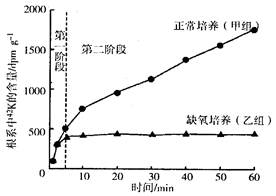 1、选择题 植物根系可以通过细胞间隙的扩散和活细胞的转运两种途径吸收无机盐离子。科学家为研究根系吸收无机盐离子的规律,分别在正常条件和缺氧条件下用含有42K完全培养液培养大麦,得到如图所示结果。1小时后将甲、乙两组的植物从42K培养液中移植到等量的清水中分别培养l~2min,都会出现42K明显外泌现象。下列分析错误的是