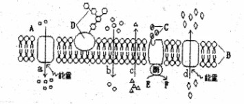 4、选择题 图示生物膜中A、B、C、D、E、F表示物质,a、b、c、d表示跨膜运输方式。正确的是