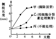 1、选择题 将甲、乙、丙三株大小相近的同种植物,分别进行不同处理,来探究影响侧芽生长的因素。实验结果如下图所示。据图判断下列说法正确的是