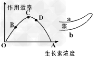 2、选择题 如下图所示,如果茎的a侧的生长素浓度对应的作用效率表现为曲线OB段,下列对茎的b侧的生长素浓度所对应作用效率的描述中,较为